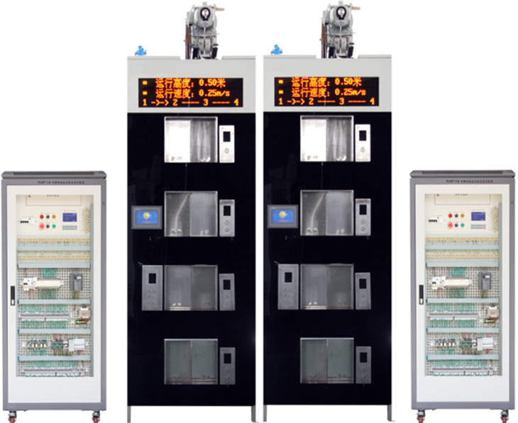3.設(shè)備為二座四層群控電梯,每部電梯系統(tǒng)均由一臺PLC控制,PLC之間通過485通信模塊交換數(shù)據(jù),電梯外呼統(tǒng)一管理,接近現(xiàn)實中的樓宇電梯控制。學(xué)生通過本裝置實訓(xùn),不但可以練習(xí)單座電梯控制、提高故障的檢測和排除能力,還可以學(xué)習(xí)電梯群控技術(shù)。
