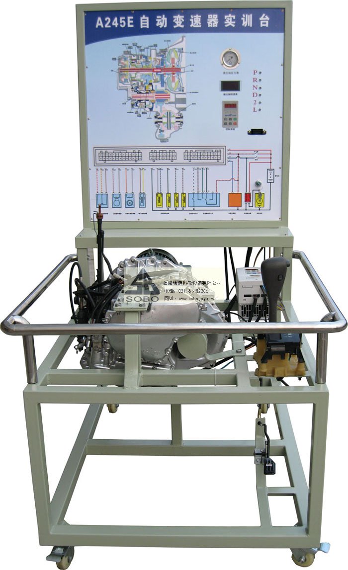 本變速器實訓臺是本公司采用一汽豐田自花冠動變速器為適應汽車教學需求而研制的,該實訓臺由電控變速器(八成新)、操作顯示面板及發(fā)動機彩色電氣原理圖電腦控制柜、可移動式臺架(萬向腳輪)、驅動系統(腳踏式油門踏板)變頻電機驅動、剎車系統(腳踏液壓盤試剎車)、啟動系統(電門鎖方式啟動)、車速傳感器、電磁閥執(zhí)行器、原車電腦、具有發(fā)動機運轉及顯示(轉速.車速.檔位)、液壓油壓力顯示表(顯示換檔過程油壓)、自動變速器電磁閥工作指示LED燈、原車OBD-Ⅱ診斷座、故障設置區(qū)可設置12路故障(老師設置任一路線路故障)、故障排除區(qū)(學生通過各種儀器、儀表、)在面板上用專用排故線連接排除故障、傳感器信號模擬等多項功能、具結構緊湊、操作方便、安全可靠、教學直觀、是汽車自動變速器實物教學不可缺少的實驗室設備之一。