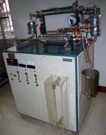 電蒸汽鍋爐、套管換熱器、蒸汽冷凝罐、蒸汽及水流量測試設備、加熱由固體調壓模塊無級調節(jié),由多路巡檢儀顯示的溫度測試系統(tǒng),不銹鋼臺架及控制屏等。