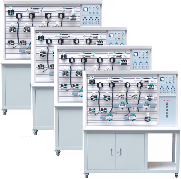 透明液壓實(shí)驗(yàn)臺(tái)為實(shí)現(xiàn)液壓傳動(dòng)課程現(xiàn)代化教學(xué)而進(jìn)行研究的最新科技成果,它填補(bǔ)了技校、中專、大專院校的液壓傳動(dòng)透明教學(xué)設(shè)備的國(guó)家空白。液壓傳動(dòng)具有重量輕、功率大、結(jié)構(gòu)簡(jiǎn)單、布局靈活、控制方便等特點(diǎn)、速度、扭矩、功率均可作無(wú)級(jí)調(diào)節(jié),能迅速換向和變速,調(diào)速范圍寬,快速性好,工作平穩(wěn)、噪音小,元器件已實(shí)現(xiàn)系列化、標(biāo)準(zhǔn)化,通用化等一系列優(yōu)點(diǎn),隨著科學(xué)技術(shù)的發(fā)展,液壓傳動(dòng)作為一種可以傳遞動(dòng)力和控制的傳動(dòng)方式,已經(jīng)日益廣泛應(yīng)用到醫(yī)療、科技、軍事、工業(yè)自動(dòng)化生產(chǎn)、起動(dòng)、運(yùn)輸、礦山、建筑、航空等各個(gè)領(lǐng)域。為了適應(yīng)在短暫課堂時(shí)間內(nèi),完成多個(gè)液壓油路的教學(xué)內(nèi)容。同時(shí)對(duì)比演示多個(gè)不同油路的工作原理。而且,使油路系統(tǒng)的安裝調(diào)試有必要的程序且不占用上課教學(xué)時(shí)間。就必須有多臺(tái)設(shè)備同時(shí)工作。同時(shí),YY-18