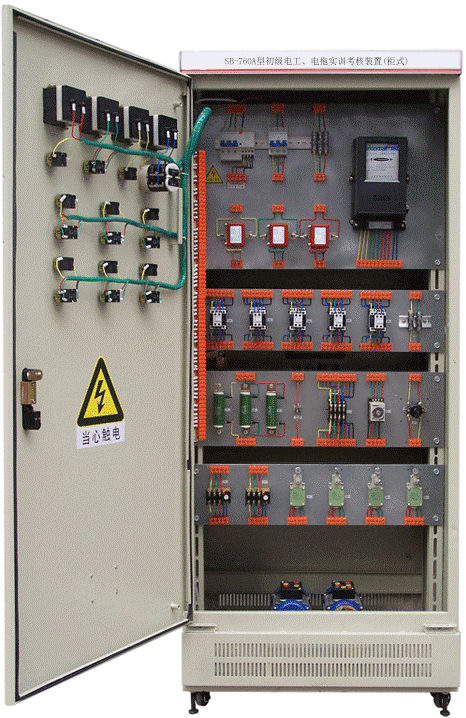 初級(jí)電工電拖實(shí)訓(xùn)考核裝置,初級(jí)電工考核柜,初級(jí)電工實(shí)訓(xùn)考核裝置是按照勞動(dòng)社會(huì)保障部頒發(fā)的“工人技術(shù)等級(jí)標(biāo)準(zhǔn)”和“職業(yè)技能鑒定規(guī)范”的內(nèi)容要求,根據(jù)初級(jí)電工培訓(xùn)考核的實(shí)際情況而設(shè)計(jì)的新一代集培訓(xùn)學(xué)習(xí)、理論驗(yàn)證、實(shí)際操作能力、考核鑒定于一體的多功能柜式設(shè)備。整臺(tái)設(shè)備以標(biāo)準(zhǔn)的電氣控制柜為主柜,利用柜體的雙面空間,布置電器 及配套實(shí)驗(yàn)器材,能完成初級(jí)電工考核鑒定中的電力拖動(dòng)控制與照明電路的實(shí)操項(xiàng)目,該電工、電拖實(shí)訓(xùn)考核裝置堅(jiān)持理論聯(lián)系實(shí)際的原則,突出技能訓(xùn)練,注重針對(duì)性、實(shí)用性、科學(xué)性,經(jīng)全國(guó)多家職業(yè)技能訓(xùn)練中心、職校、技校使用證明,該柜體設(shè)計(jì)合理、實(shí)操方便,占地面積少。為延長(zhǎng)電器的使用壽命,各電器的接點(diǎn)都與接線端子相連,再讓學(xué)生在接線端子上接線,連接電機(jī)、電器來(lái)完成各項(xiàng)控制實(shí)驗(yàn),有效降低材料消耗,延長(zhǎng)使用壽命。該套設(shè)備適用于各勞動(dòng)職業(yè)技能鑒定部門(mén),同時(shí)適應(yīng)各大、中專、技校、職校初級(jí)電工、電拖專業(yè)教學(xué)與實(shí)訓(xùn)考核。
