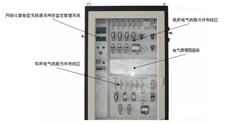 技能實訓考核柜 四個機床操作按鈕及機床指示區(qū)面板 四個機床電氣線路元器件布線區(qū) 兩個機床轉接模塊區(qū) 網(wǎng)絡化智能型機床實訓考核鑒定管理系統(tǒng) |