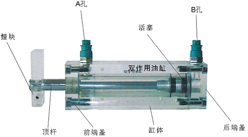 2、雙作用油缸的缸體,端蓋,行程撞塊,撞塊支承等均采用了進口透明有機玻璃材料。頂桿采用了45#中碳鋼,并配合油接頭,密封圈,內(nèi)六角螺絲等標準件精制而成。能通過它明確地觀察活塞、頂桿、油封、油孔等結構及其運行過程。