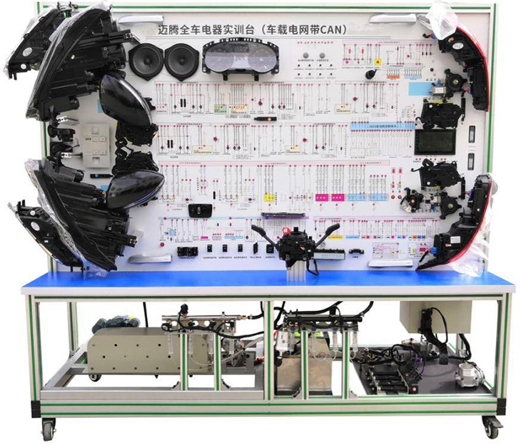 2.設(shè)備面板采用耐創(chuàng)擊、耐污染、防火、防潮的高級鋁塑板,表面經(jīng)特殊工藝噴涂底漆處理;面板打印有永不褪色的彩色電路圖;學(xué)員可直觀對照電路圖和實(shí)物,認(rèn)識和分析汽車整車電器各系統(tǒng)的工作原理。