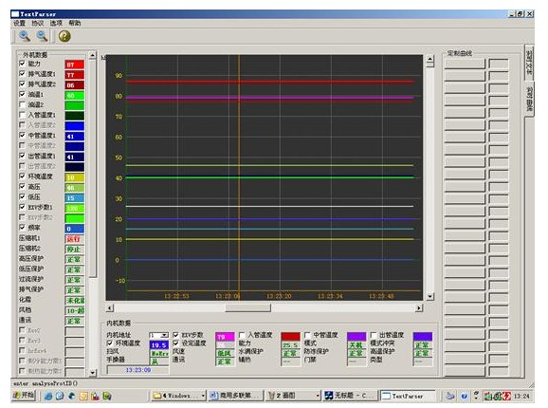 中央空調(diào)機(jī)由于工程復(fù)雜,設(shè)備分散,有的已經(jīng)裝修在開花板上測試程序,一但出現(xiàn)了故障,工程量相當(dāng)大,為了能夠快速準(zhǔn)確地測出故障是由主機(jī)機(jī)組還是室內(nèi)機(jī)的故障的,每個生產(chǎn)廠家根據(jù)生產(chǎn)的和維修的需要而開發(fā)了中央空調(diào)測試程序?蓽y試壓縮機(jī)的運(yùn)轉(zhuǎn)頻率,傳感器的各種數(shù)據(jù),電子膨脹閥的工作步數(shù)等幾十種中央空調(diào)的工作數(shù)據(jù)和狀態(tài),軟件可實現(xiàn)對內(nèi)機(jī)的控制,,可以對1-64臺內(nèi)機(jī)的狀態(tài)進(jìn)行設(shè)定。是高校提供了好的研究的學(xué)習(xí)設(shè)備。