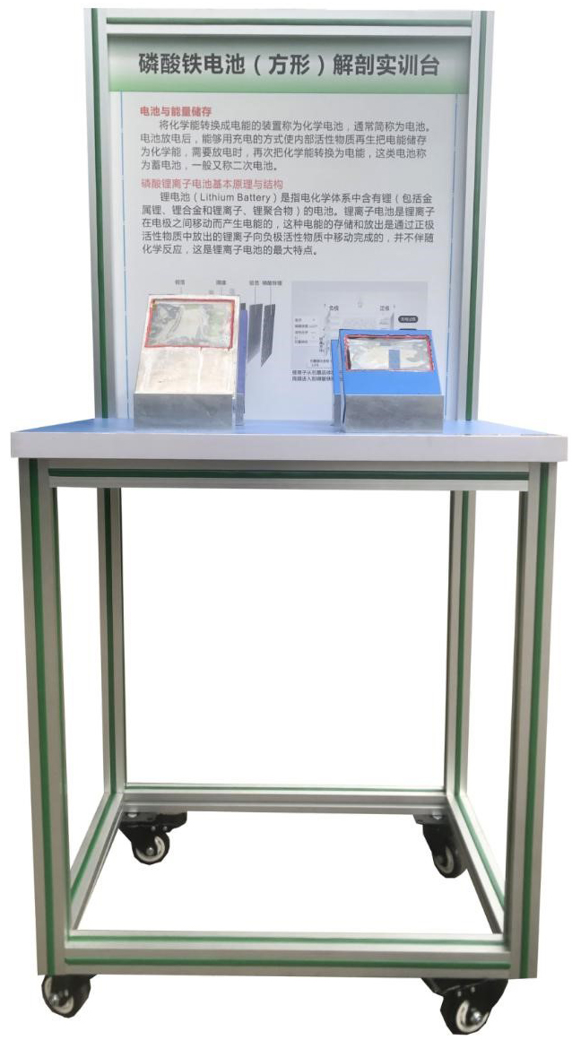 磷酸鐵鋰動(dòng)力電池3.2V20AH(兩件,其中一件解剖),酸鐵鋰動(dòng)力電池3.2V50AH(兩件,其中一件解剖),單體電池充電裝置,可移動(dòng)平臺(tái)和教板。