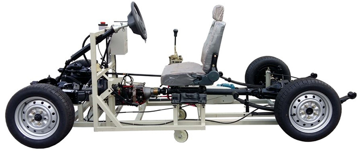 包括前后懸掛系、轉(zhuǎn)向系、傳動系、手動變速器及掛檔機構(gòu)、制動系等系統(tǒng)、安裝腳輪的可移動式臺架等組成。