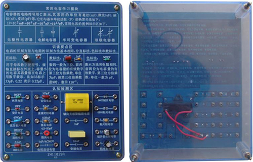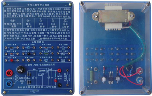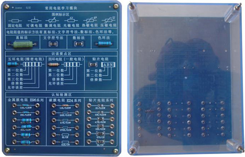 底盒使用190mm×145mm的開模有機透明塑料底盒,模塊面板采用印制電路板PCB工藝,可以直觀看到器件的實物及相關(guān)的原理介紹。對于典型應用及易損器件安裝在面板背面,透過透明底盒能夠看到器件實物,方便感性認識、檢測測試,同時也能防止器件的損傷。
