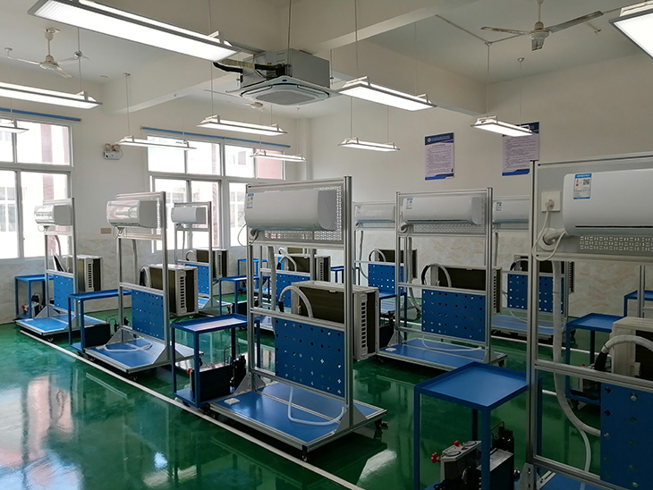 制冷與暖通實訓(xùn)室、水暖與空調(diào)實訓(xùn)室主要配備暖通技術(shù)實訓(xùn)臺、中央空調(diào)綜合實訓(xùn)裝置、中央空調(diào)微機控制實驗臺、供暖系統(tǒng)實訓(xùn)設(shè)備、空調(diào)、制冷、換熱綜合實驗臺、循環(huán)式空調(diào)過程實驗裝置、熱離心泵特性曲線測定實驗臺、水離心泵綜合試驗臺、采暖模擬訓(xùn)練系統(tǒng)、制空氣源熱泵熱機實訓(xùn)考核裝置、冷空調(diào)設(shè)備實訓(xùn)臺、空調(diào)技術(shù)實訓(xùn)臺、暖通技術(shù)實訓(xùn)室以暖通空調(diào)設(shè)備為主,滿足暖通空調(diào)專業(yè)相關(guān)的實訓(xùn)實驗操作、材料設(shè)備的展示、設(shè)備系統(tǒng)安裝展示、運行展示及現(xiàn)場教學(xué)等功能;制冷空調(diào)設(shè)備實訓(xùn)室以冰箱、分體式空調(diào)器拆裝、移機、調(diào)試、故障模擬與排除等項目為教學(xué)內(nèi)容,重在培養(yǎng)學(xué)生對電冰箱和空調(diào)器制冷系統(tǒng)故障診斷和維修能力和空調(diào)安裝能力,同時進行“制冷空調(diào)系統(tǒng)安裝維修工”的職業(yè)技能的考核和鑒定,可為校內(nèi)、校外培訓(xùn)相應(yīng)的中級和高級工;空調(diào)技術(shù)實訓(xùn)室以家用多聯(lián)機空調(diào)系統(tǒng)設(shè)備安裝、設(shè)備檢修為教學(xué)內(nèi)容,兼顧熱水采暖系統(tǒng)安裝、給排水管路制作實訓(xùn)操作等。重在培養(yǎng)學(xué)生對多聯(lián)機空調(diào)系統(tǒng)的安裝和故障診斷和維修能力,同時進行“制冷空調(diào)系統(tǒng)安裝維修工”的職業(yè)技能的考核和鑒定等;制冷技術(shù)實訓(xùn)室主要有裝配式冷庫、現(xiàn)代冷庫技術(shù)綜合實訓(xùn)考核設(shè)備、凍干機等設(shè)備。暖通空調(diào)實訓(xùn)室設(shè)備主要培養(yǎng)學(xué)生對典型食品冷加工設(shè)備的拆裝維修能力;冷藏庫的調(diào)試、運行維護及其排除故障的能力;冷庫制冷工藝設(shè)計能力。并對學(xué)生進行“制冷空調(diào)系統(tǒng)安裝維修工”職業(yè)技能考核鑒定,同時具備制冷與空調(diào)專業(yè)行業(yè)技能大賽訓(xùn)練的條件。